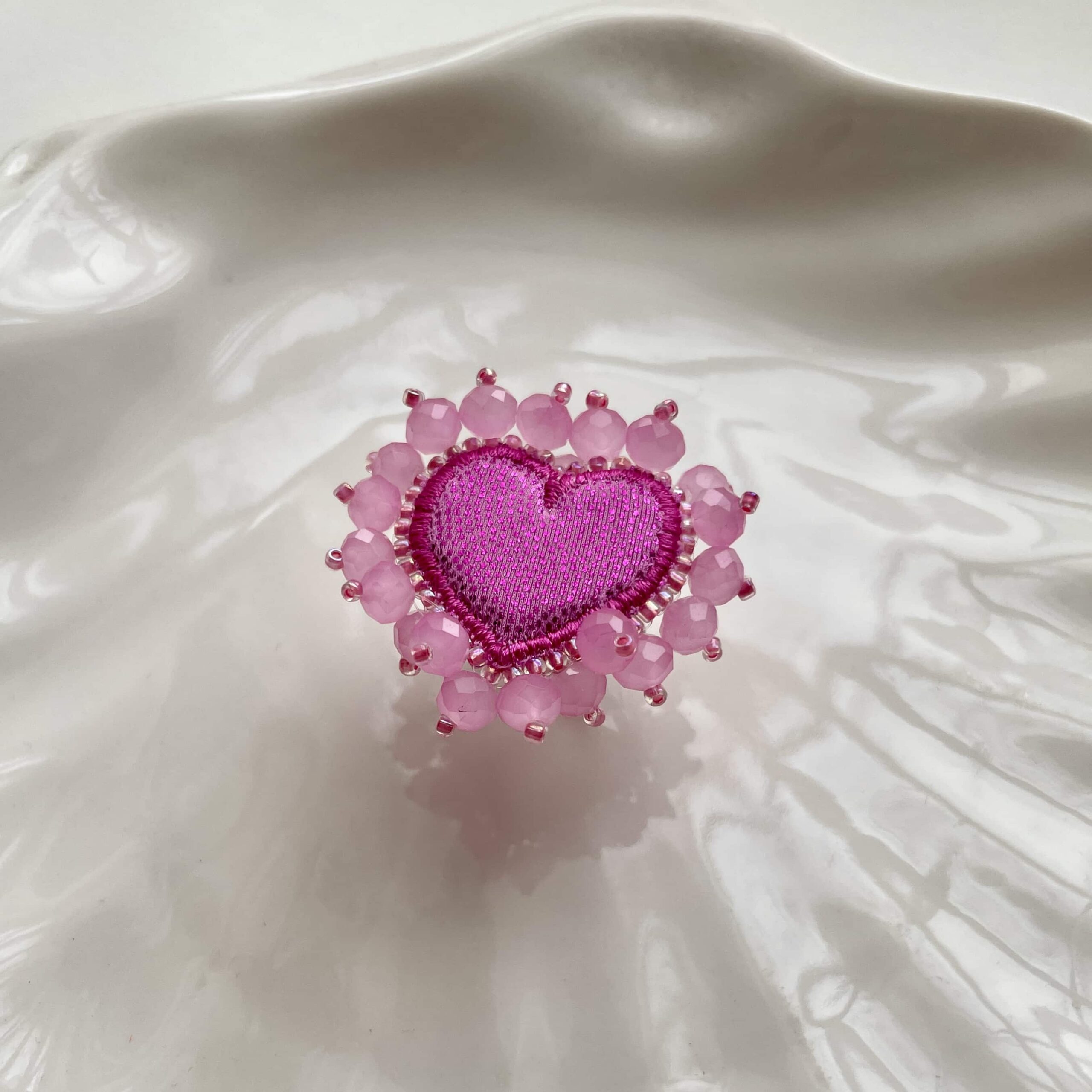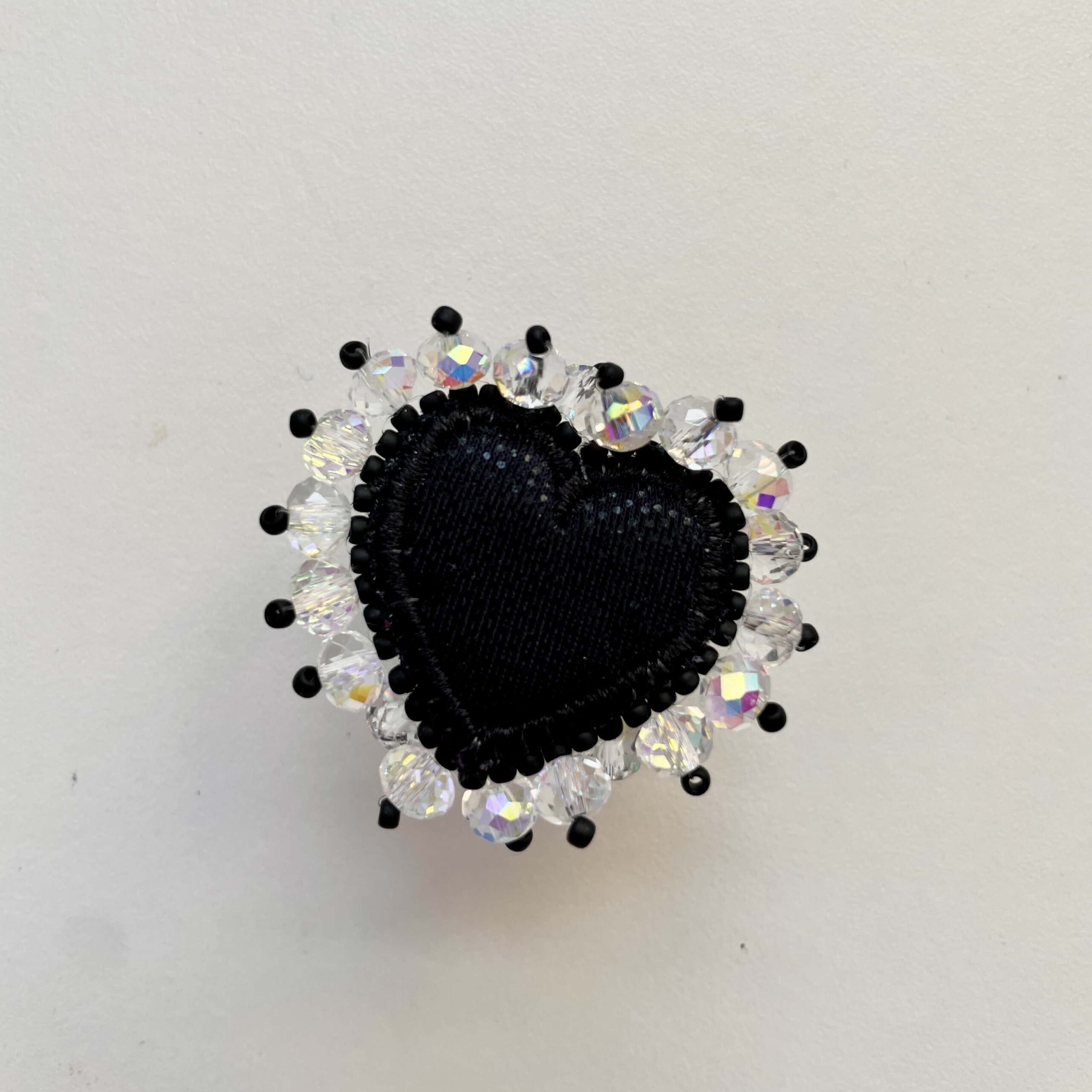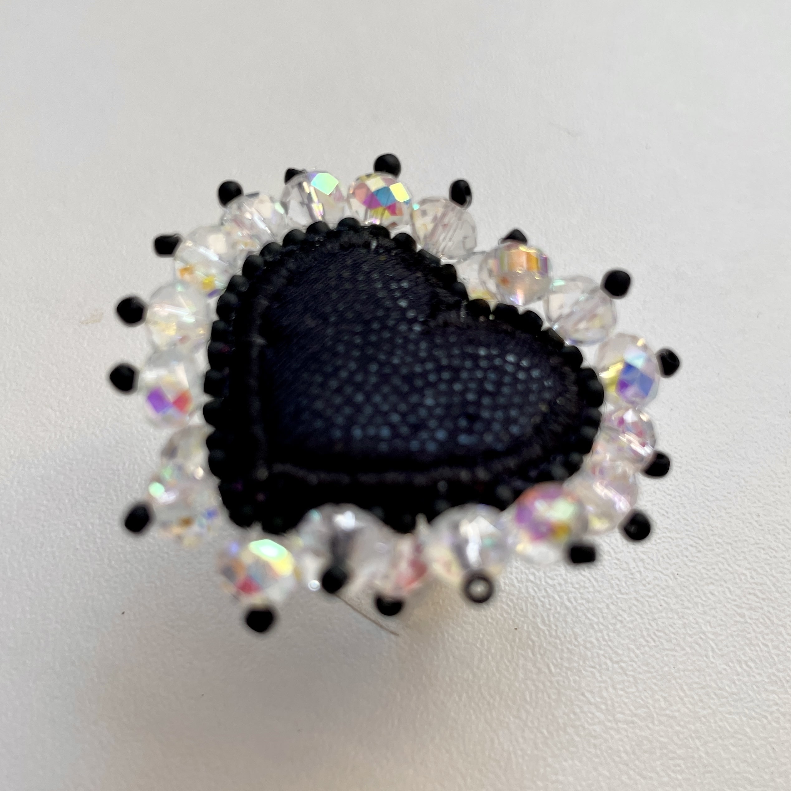 Este anillo es puro arte: un corazón bordado a mano con cristales facetados que atrapan la luz de una manera mágica.