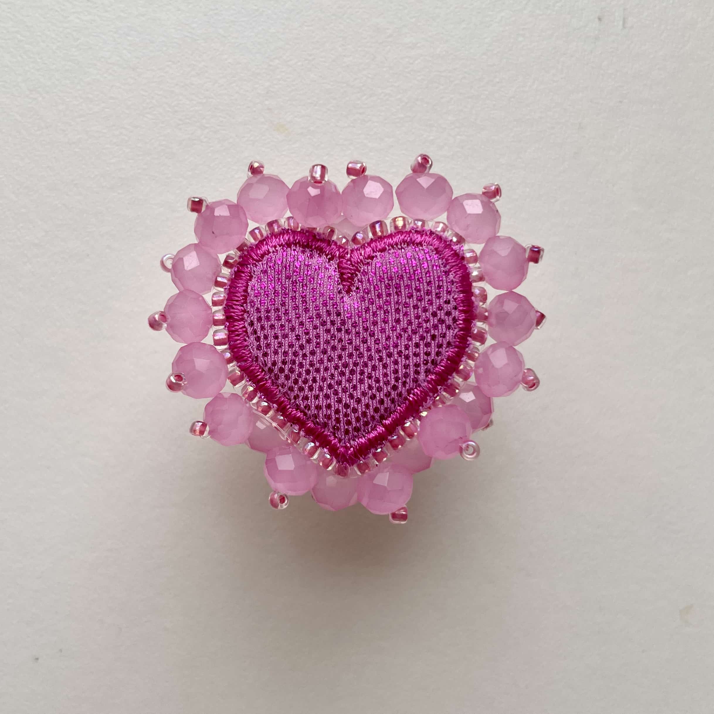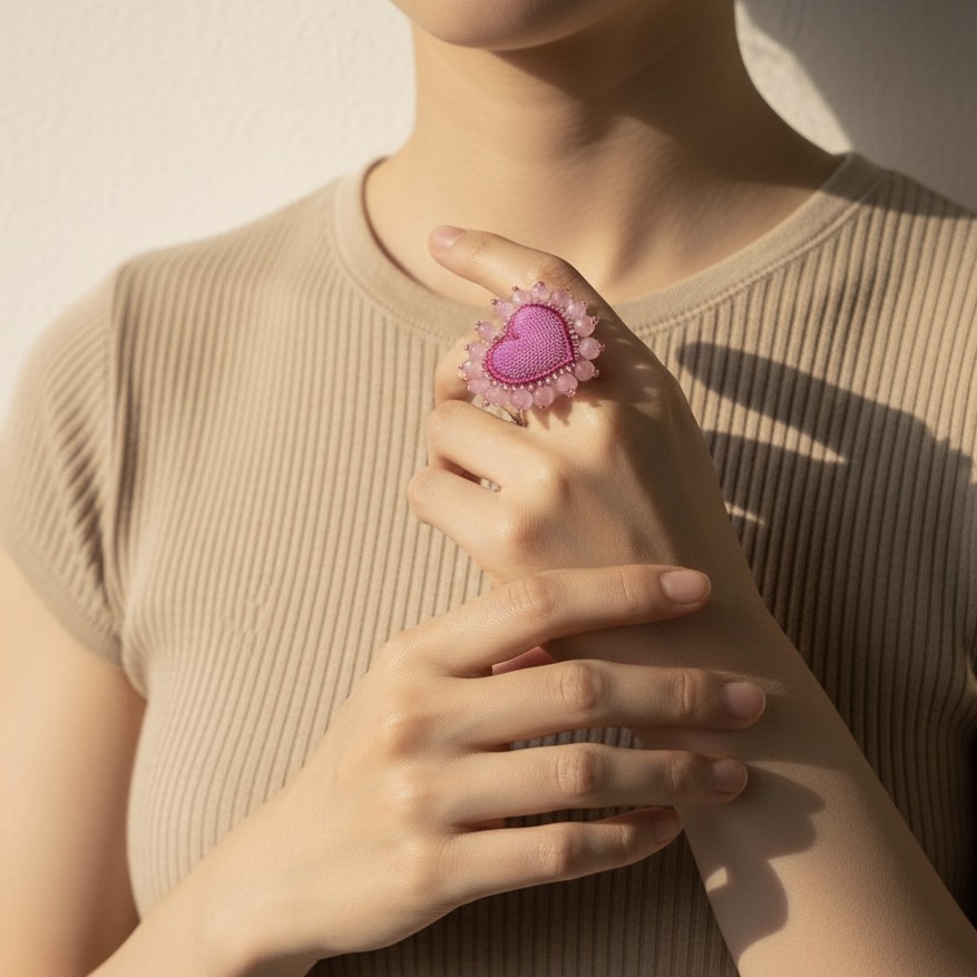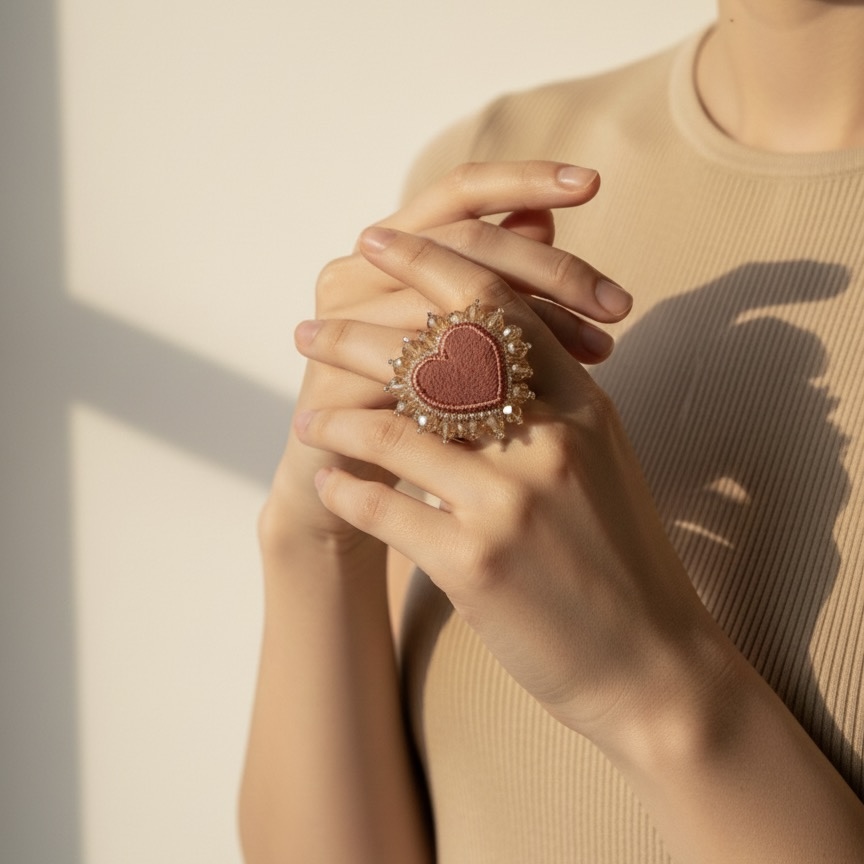 Este anillo es puro arte: un corazón bordado a mano con cristales facetados que atrapan la luz de una manera mágica.