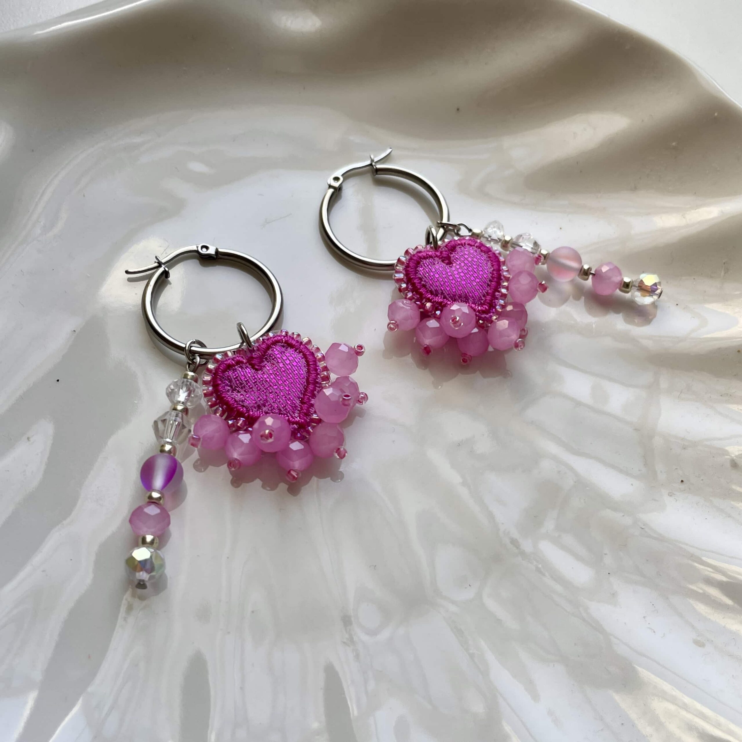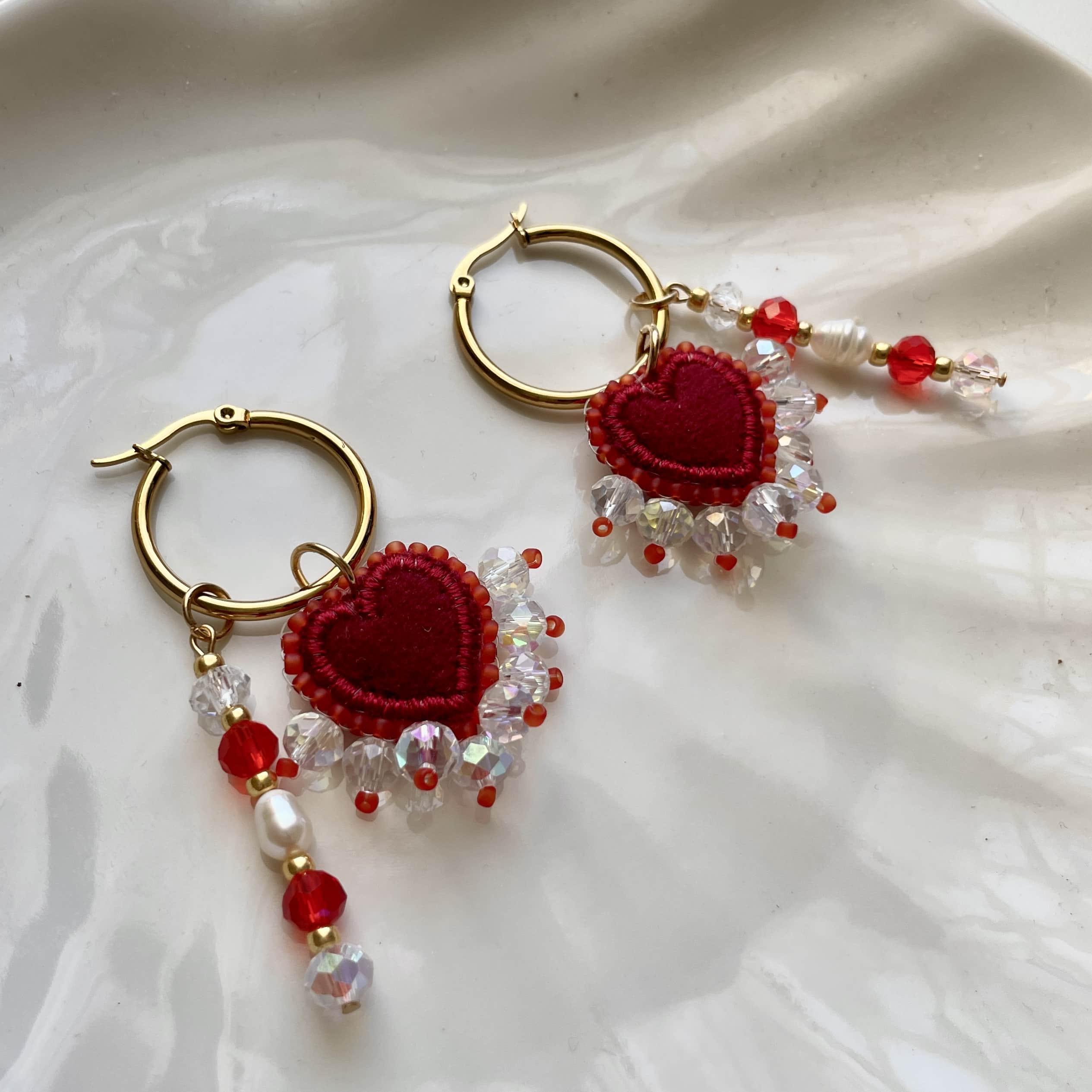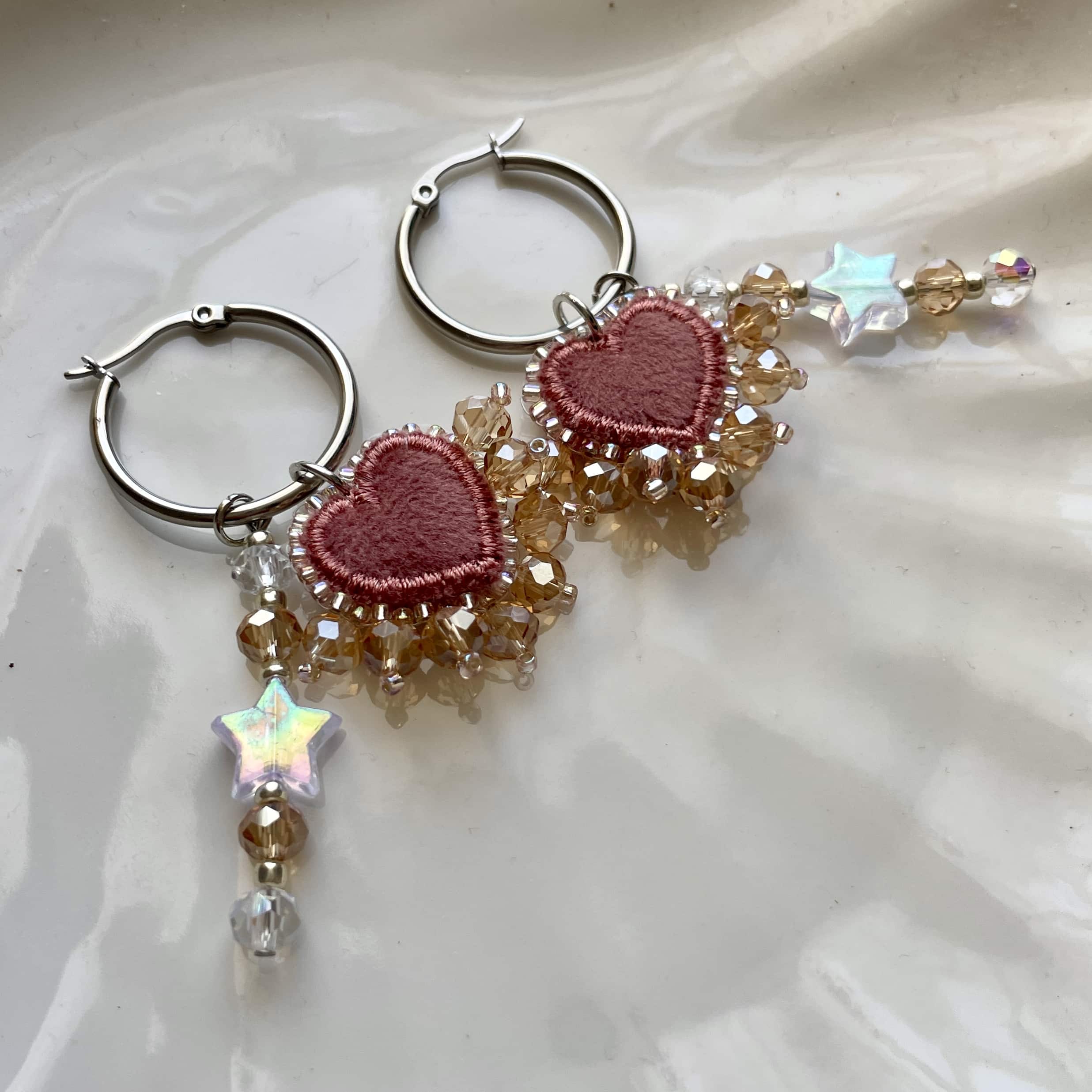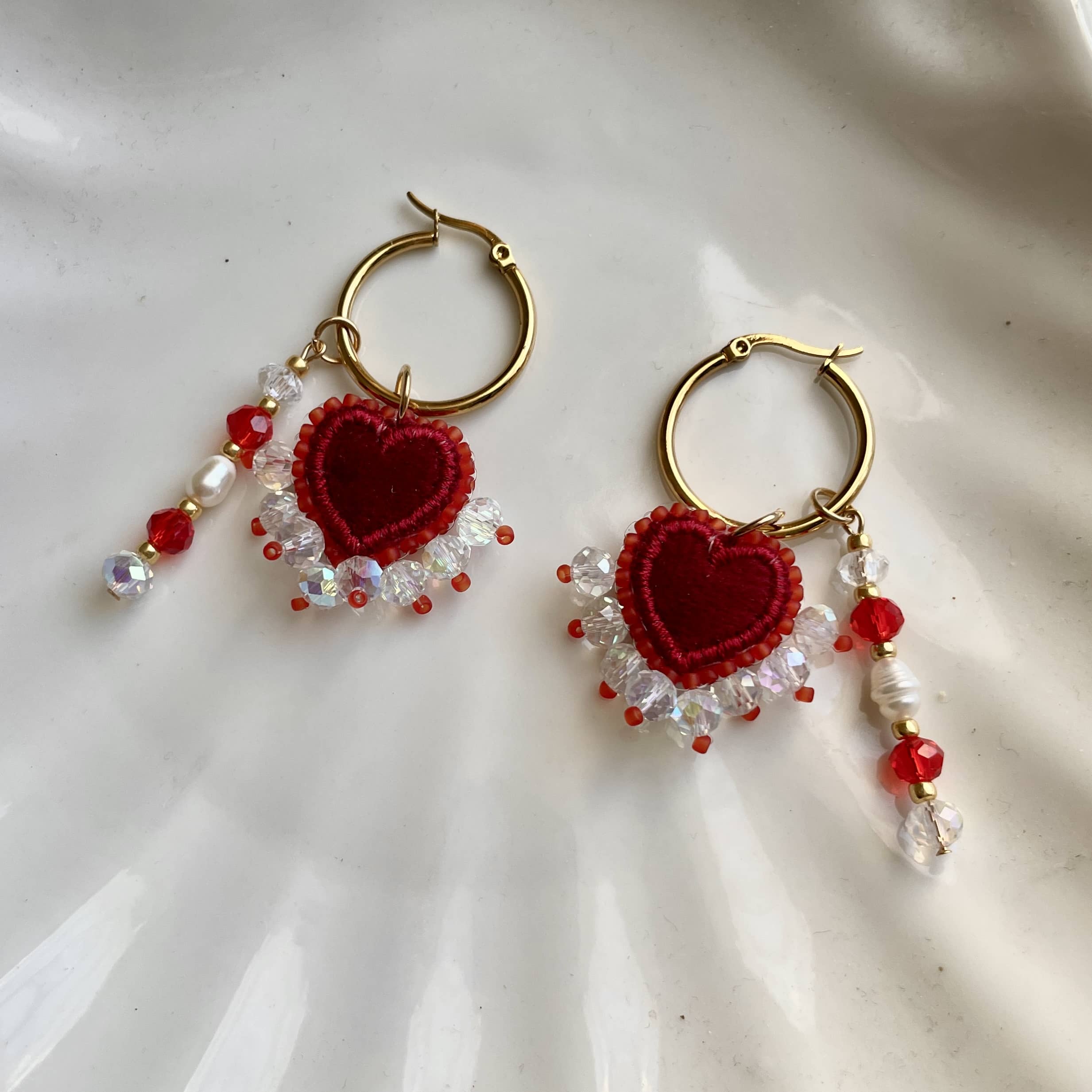 Aros hechos en tela e intervenidos a mano con cristales facetados y mostacillas