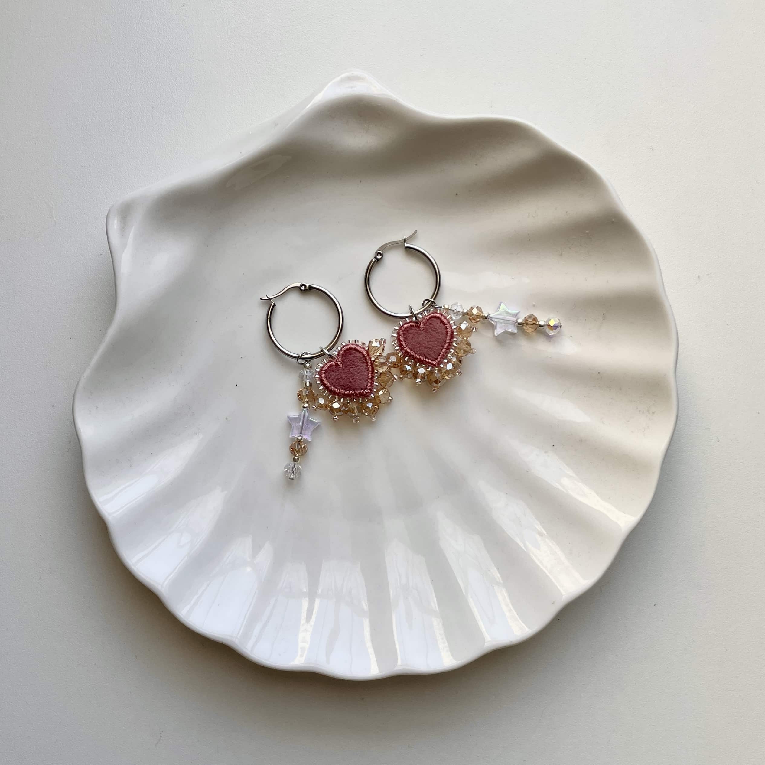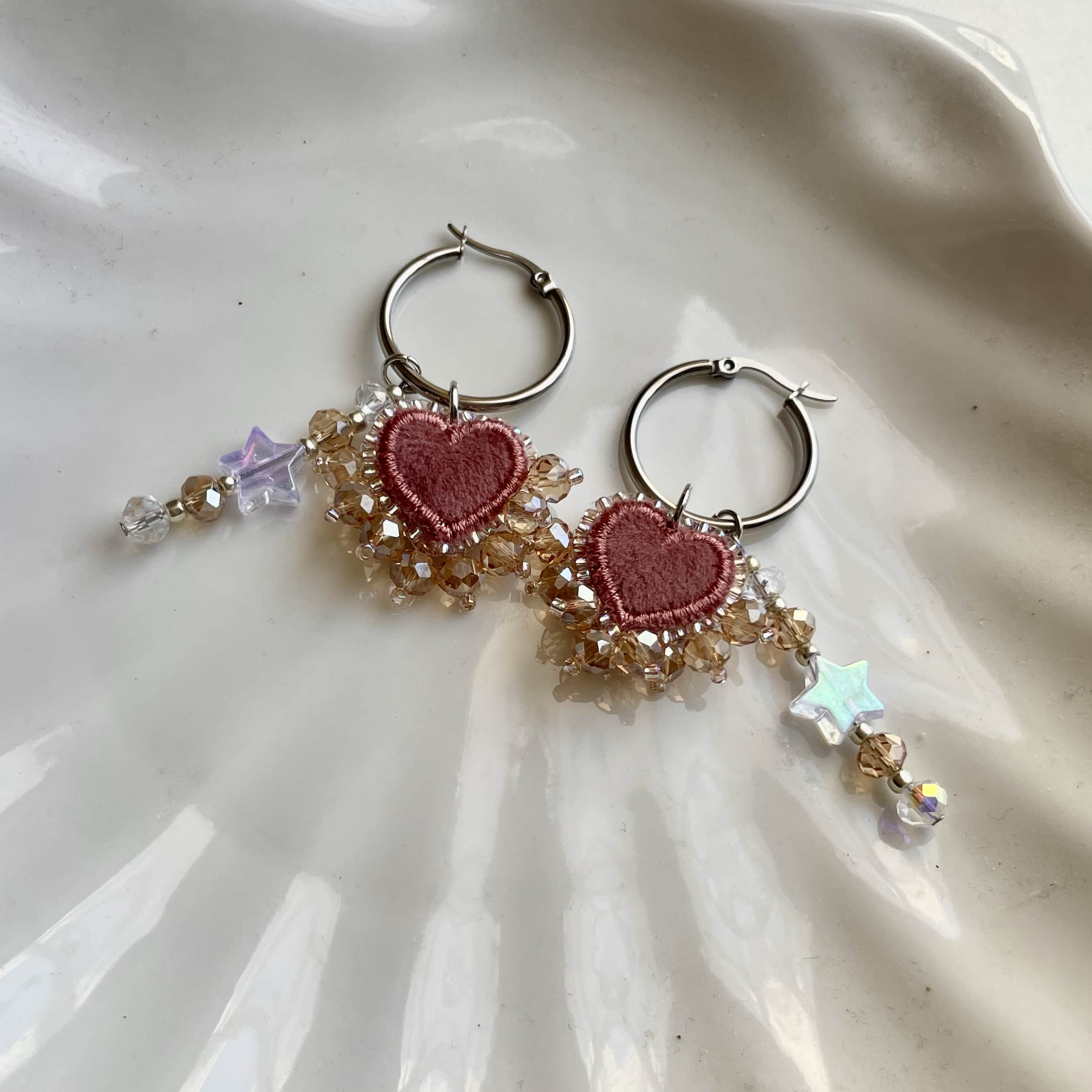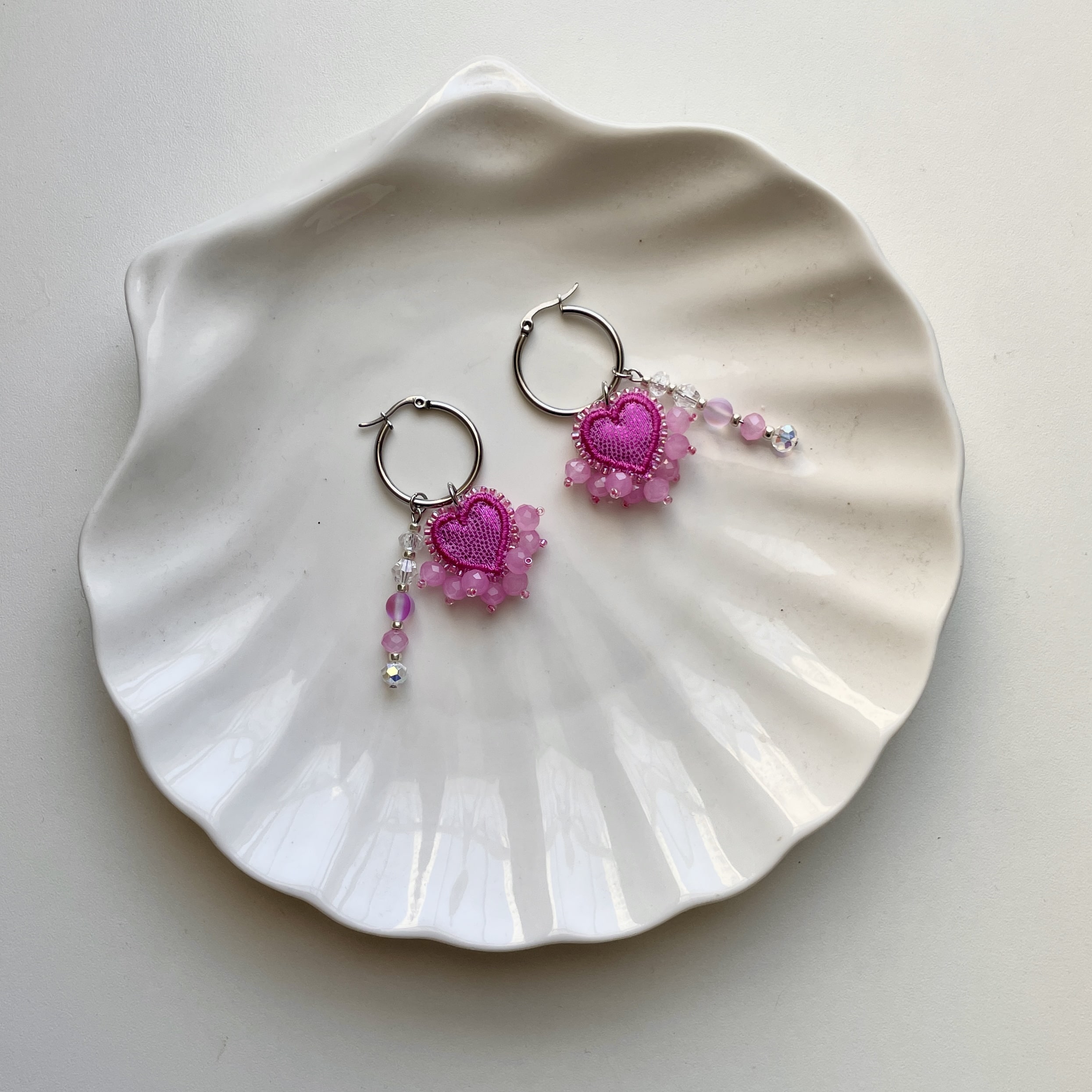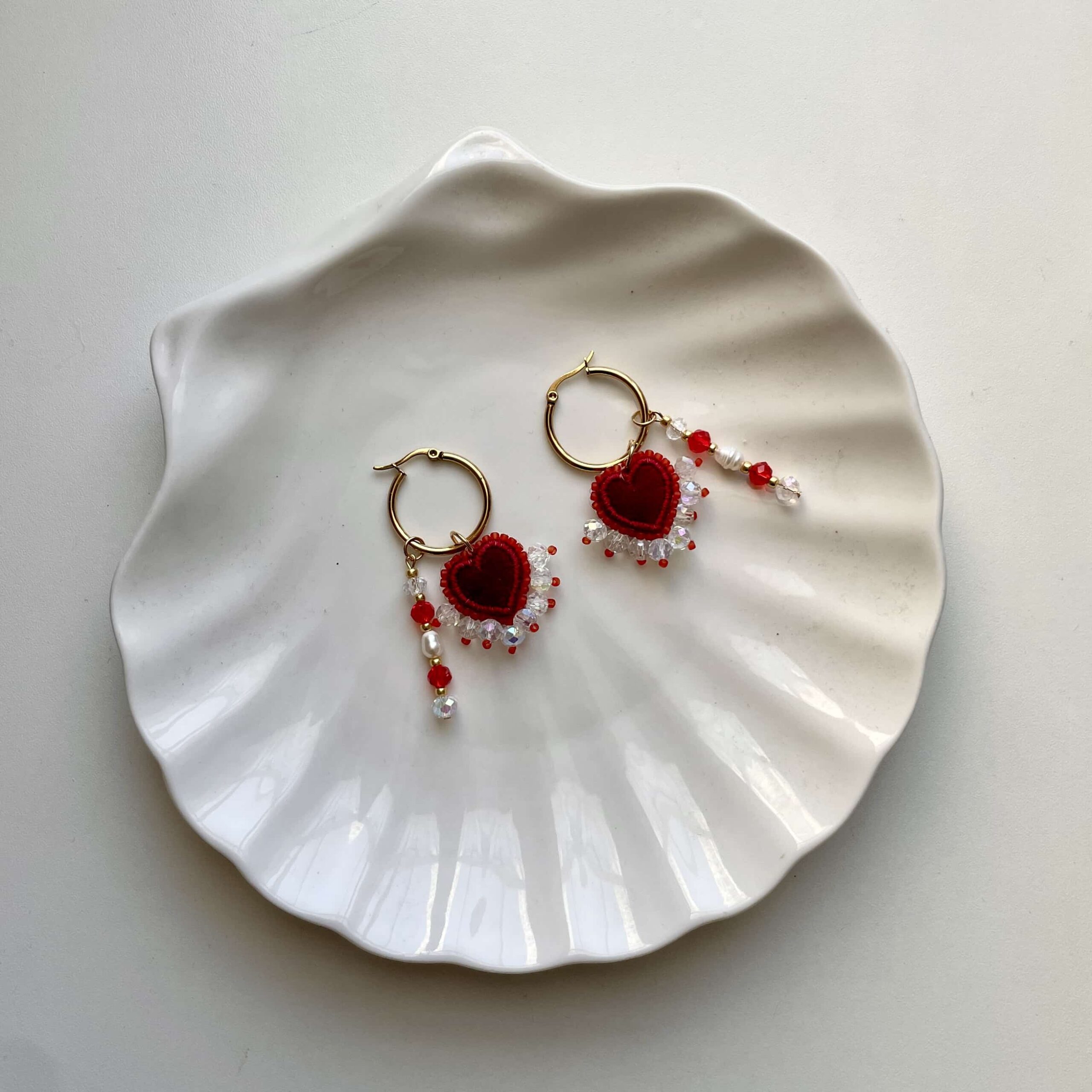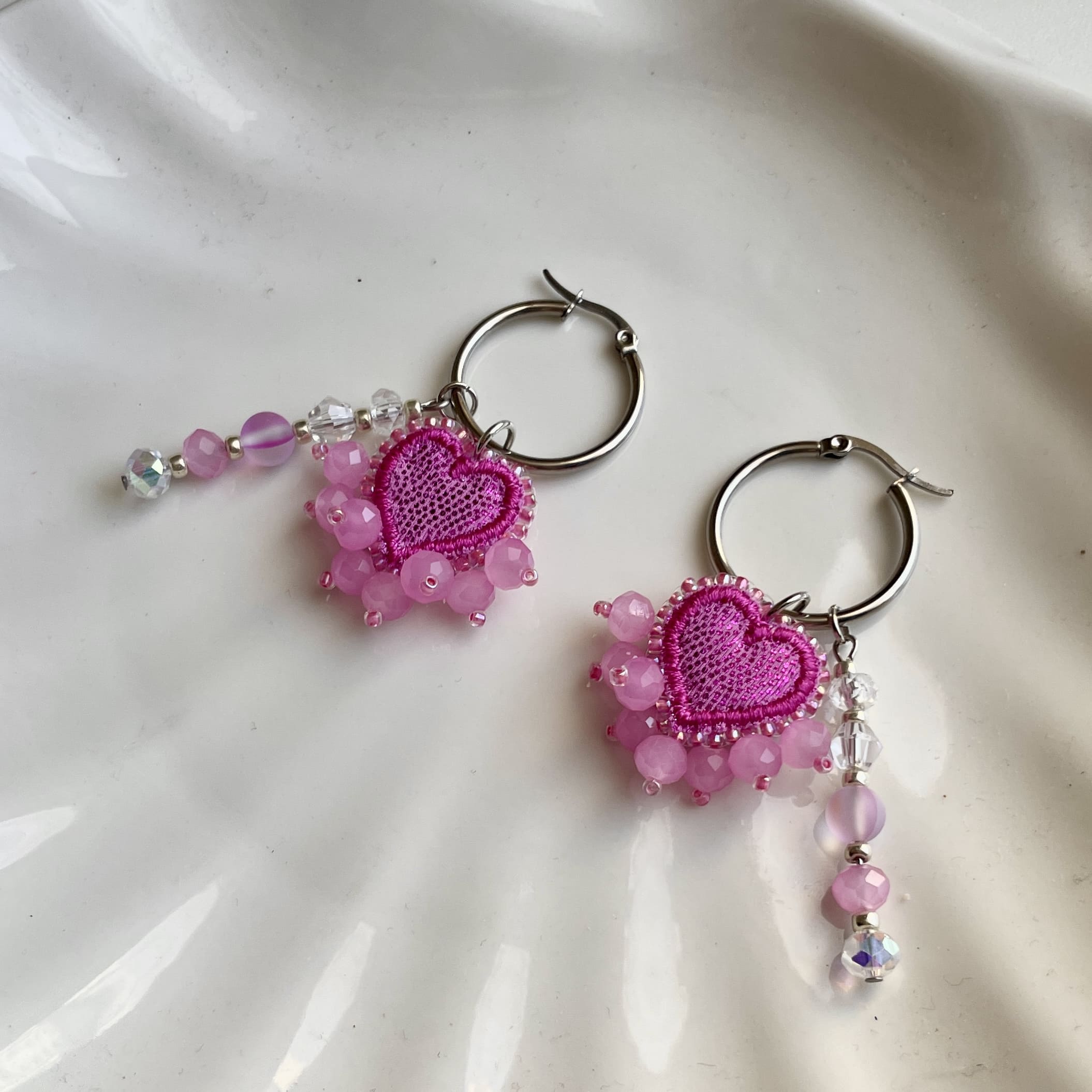 Aros hechos en tela e intervenidos a mano con cristales facetados y mostacillas