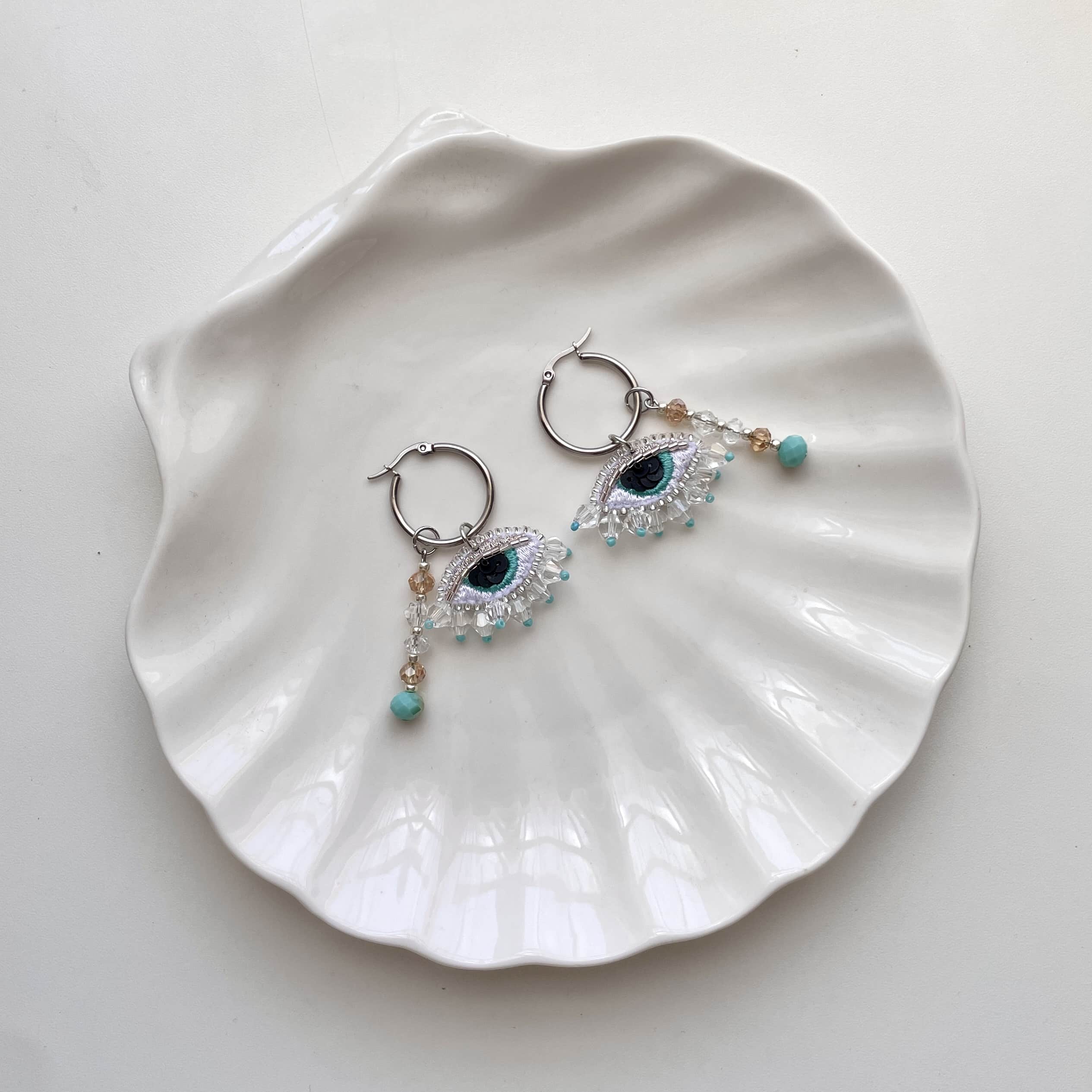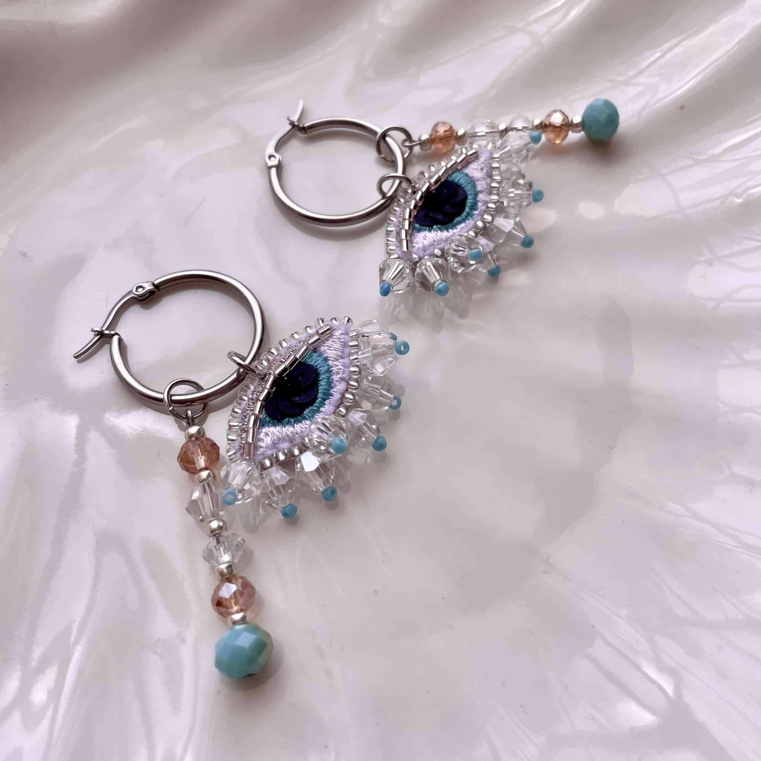 Aros hechos en tela e intervenidos a mano con cristales facetados, lentejuelas y mostacillas