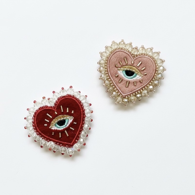 Prendedor bordado en felpa e intervenido a mano, con canutillos, cristales facetados y mostacillas.